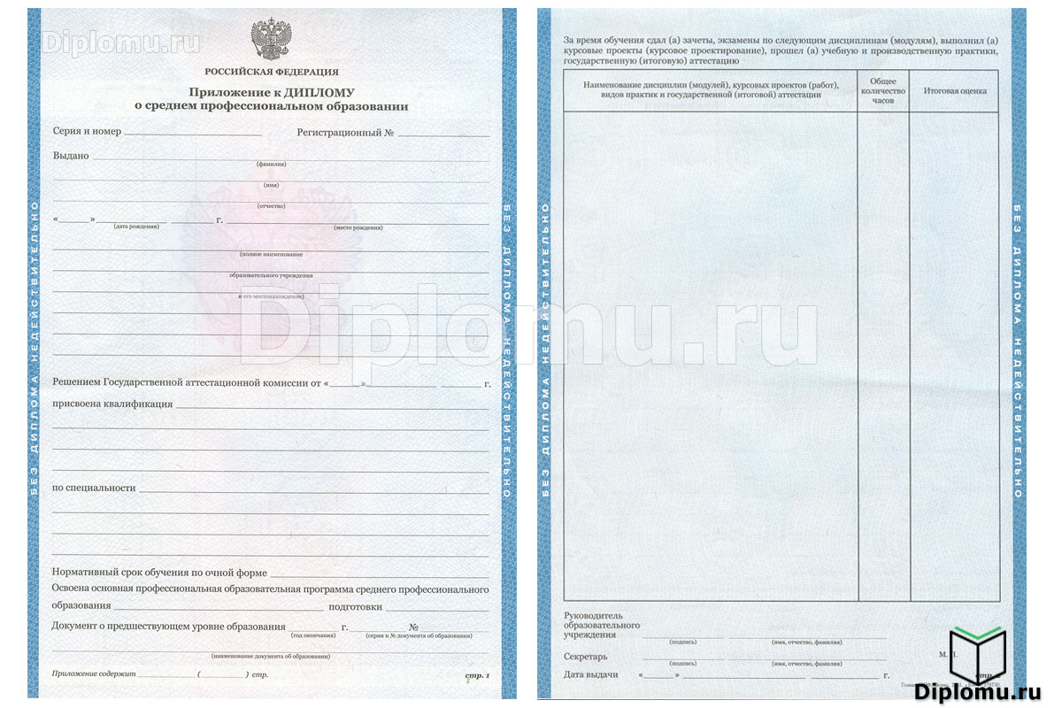 Приложение к диплому ССУЗа с 1997 до 2013 года при покупке отдельно; |